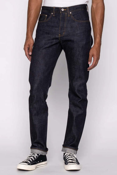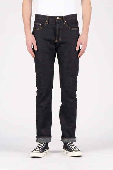The UB222 is a tapered fit: roomy seat and thigh tapering to a narrow leg opening cut and sewn from 11oz raw indigo selvedge denim with a touch of ...