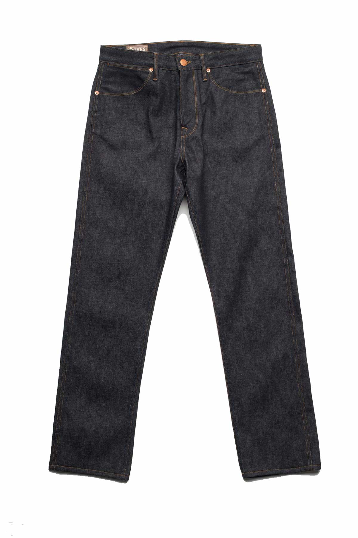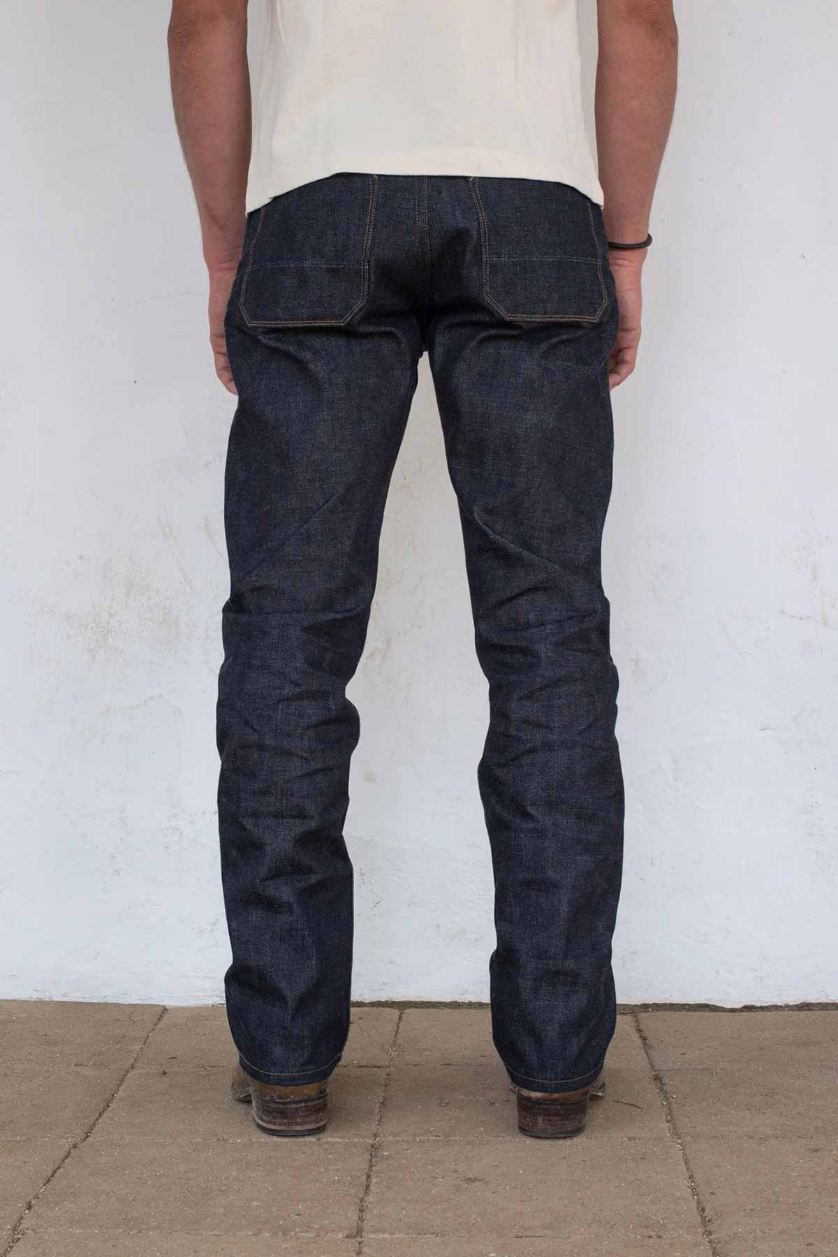 A generous top block with an elongated front rise matches with a fuller thigh and moderate taper for a fit that works great with any pair of boots. The construction details include a yoke over, a double needle outseam, and a preserved selvedge detail with the folded outseam.