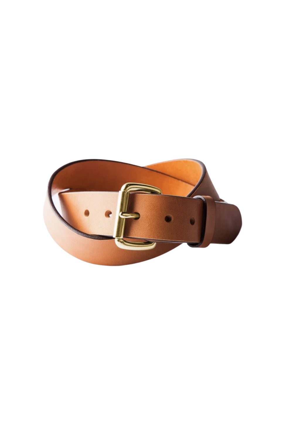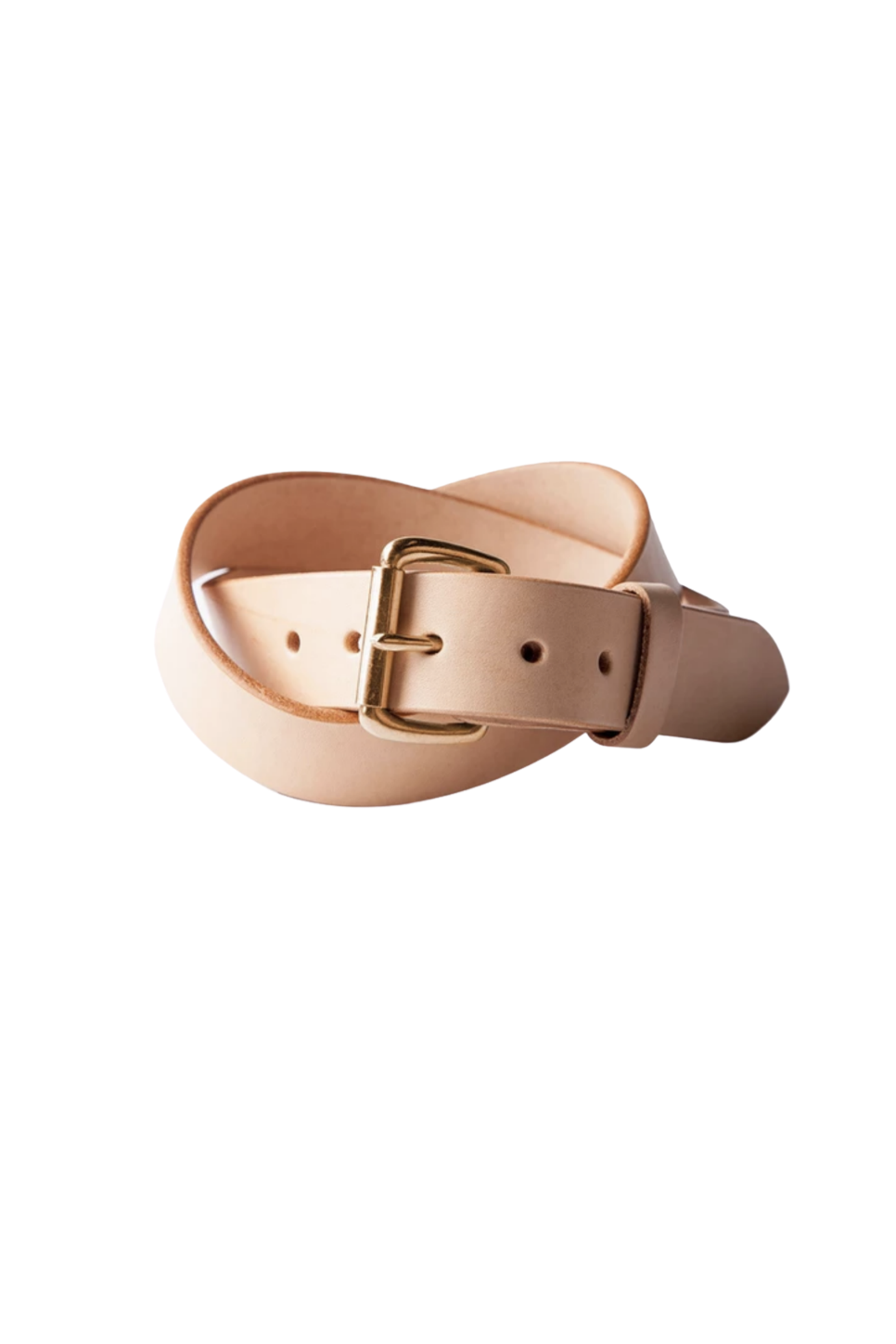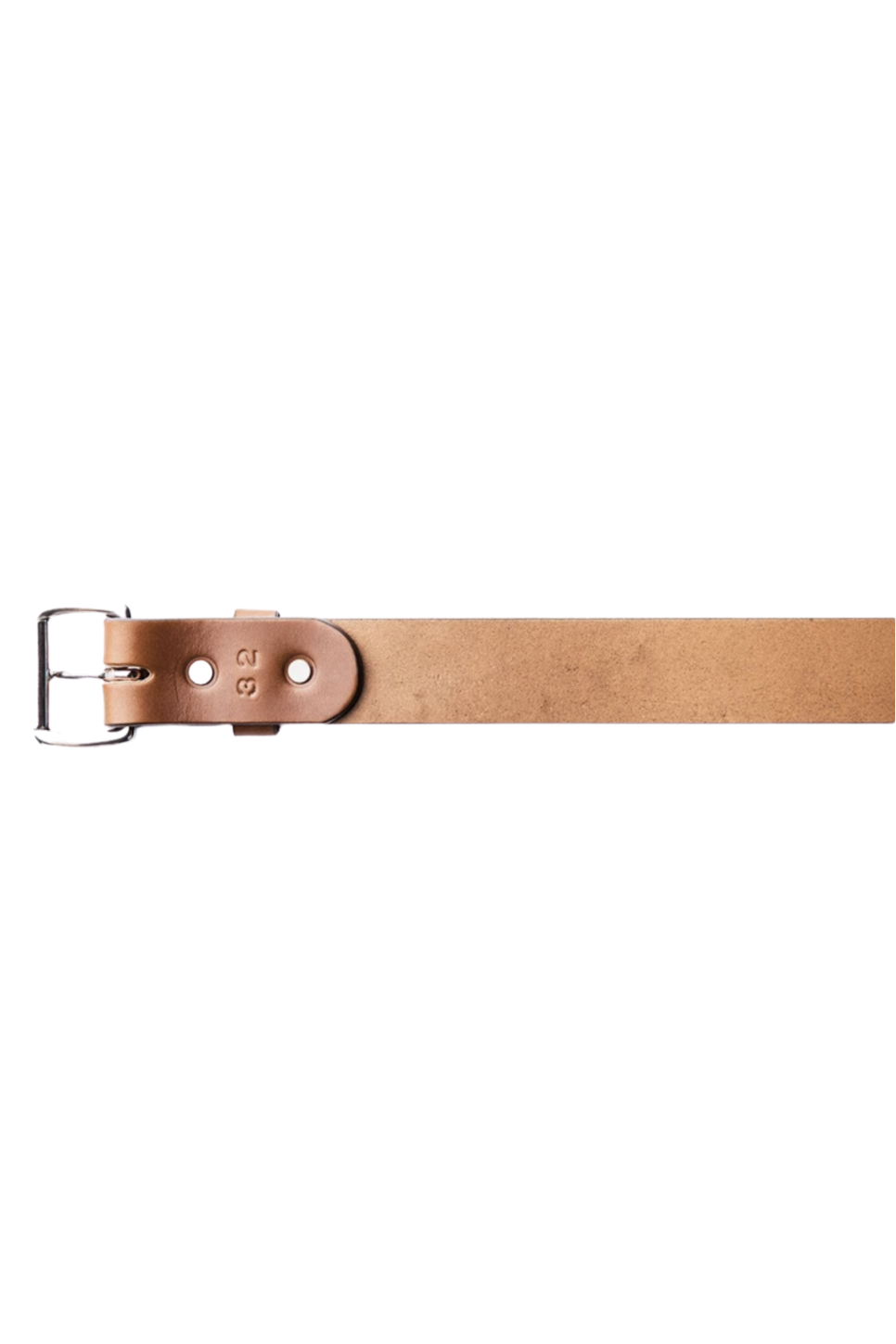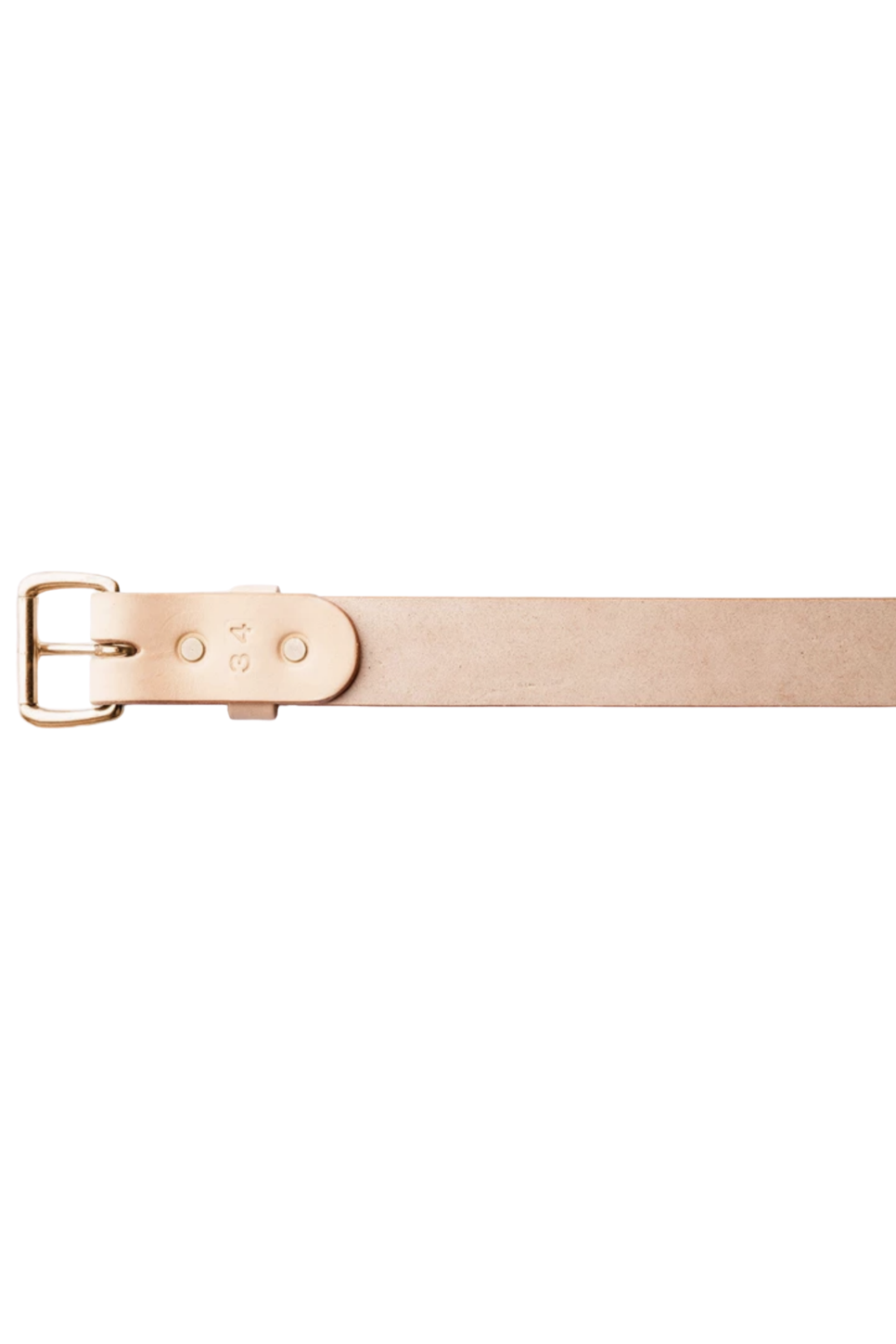 The Standard Belt emphasizes classic, utilitarian styling and is built to last and to improve with age. Constructed from 10-11 oz. vegetable-tanned natural tooling strap leather, thel Standard Belt features a matching leather keeper and a range of hardware choices. The edges are dyed, burnished, and waxed by hand, and each belt is stamped with the signature maker's mark.