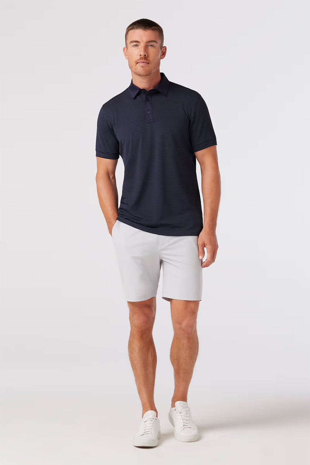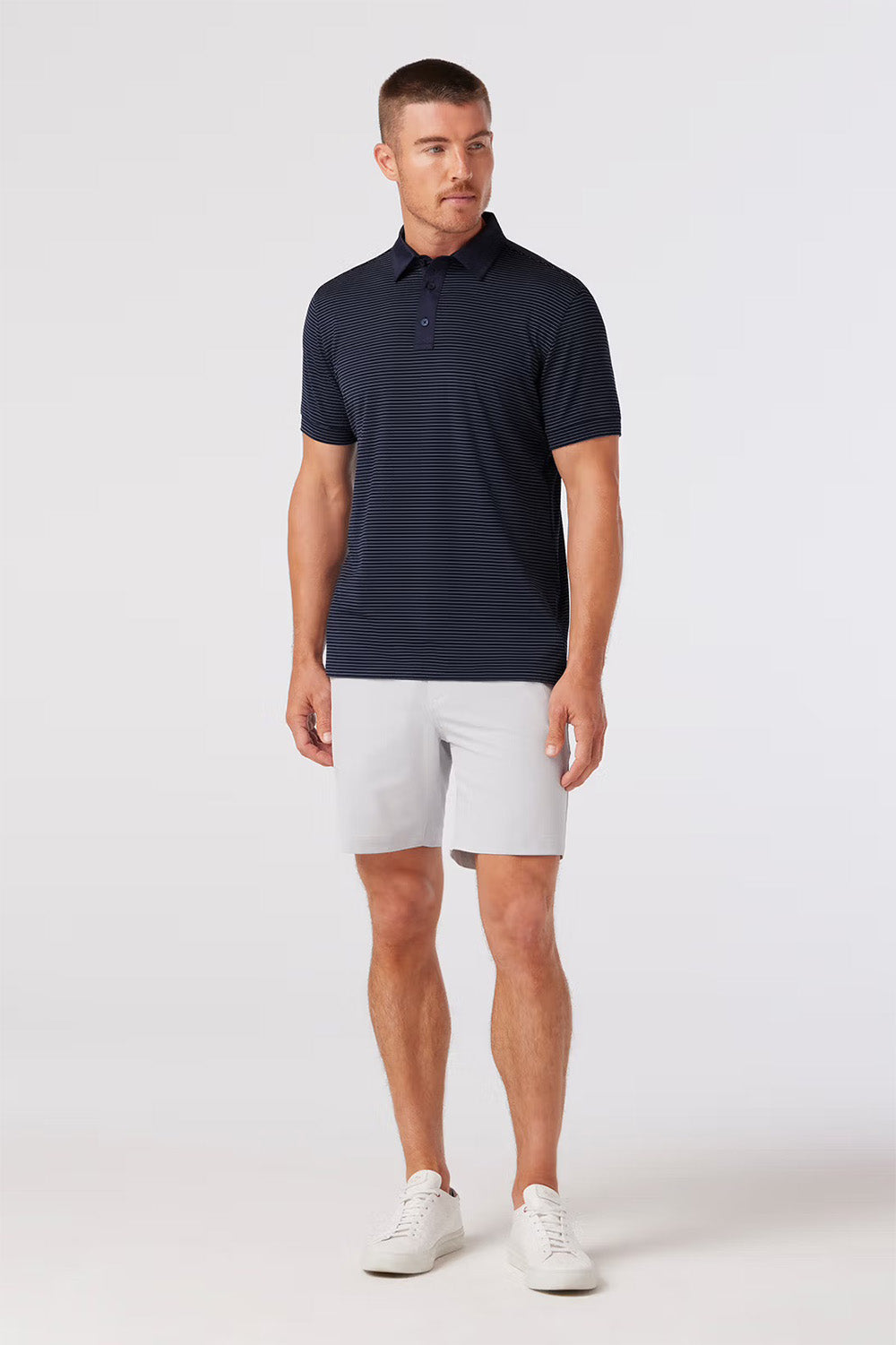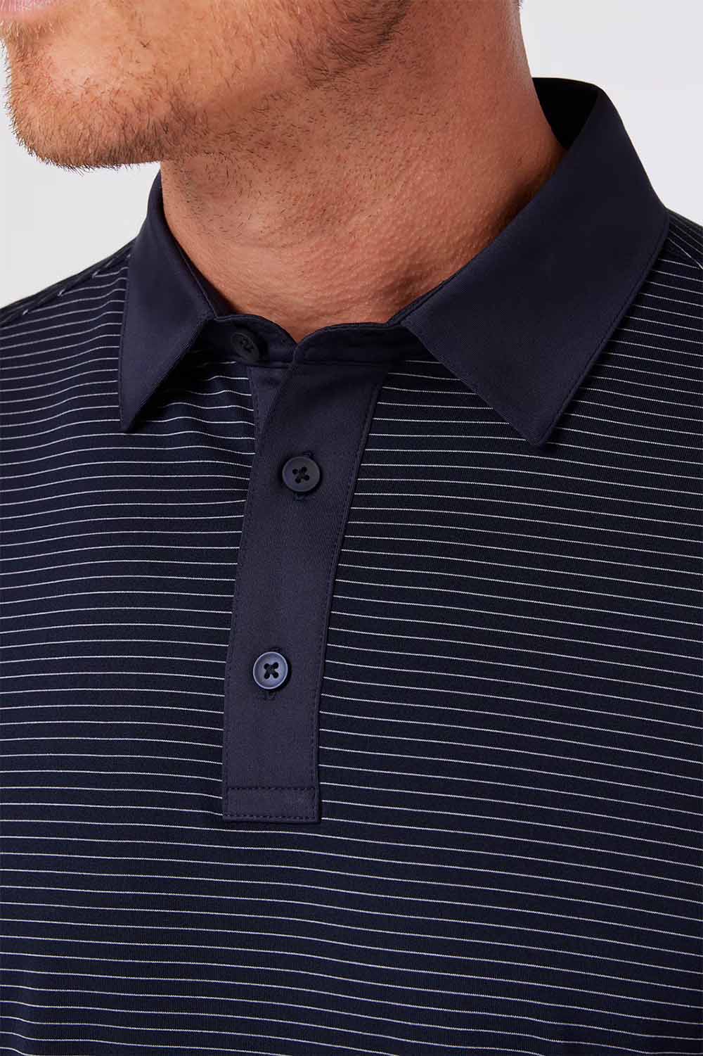 All Versa, no vice. This lightweight, moisture-wicking Navy Lavender Stripe Versa Polo is the perfect fit for the golf course and the most comfortable feeling since a tap-in par. Get yours and go low. Get yours and go anywhere.